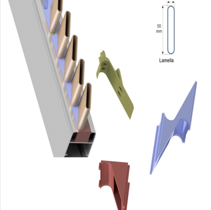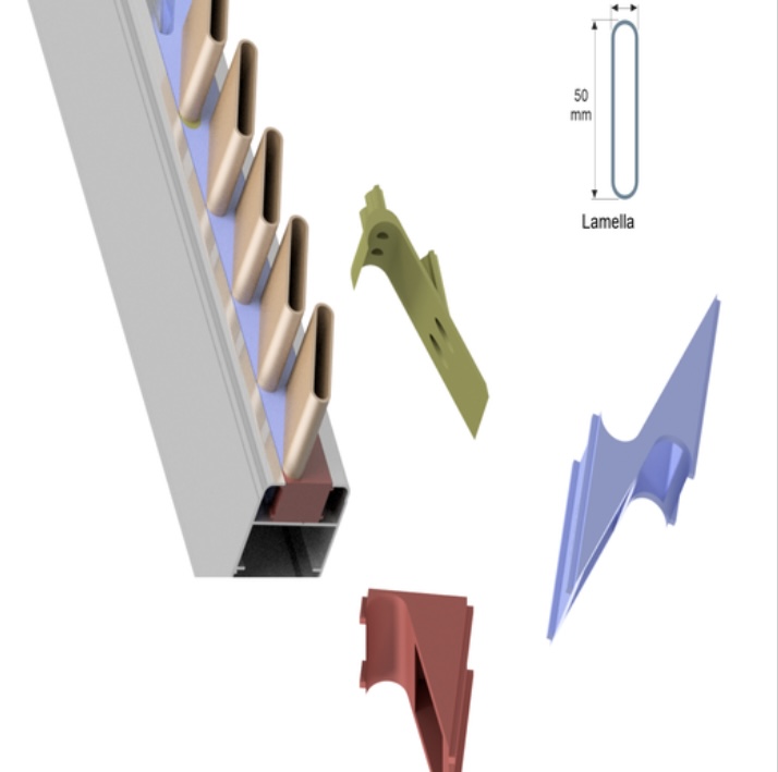 Sistema per lamelle in legno o alluminio con portalamelle unico.